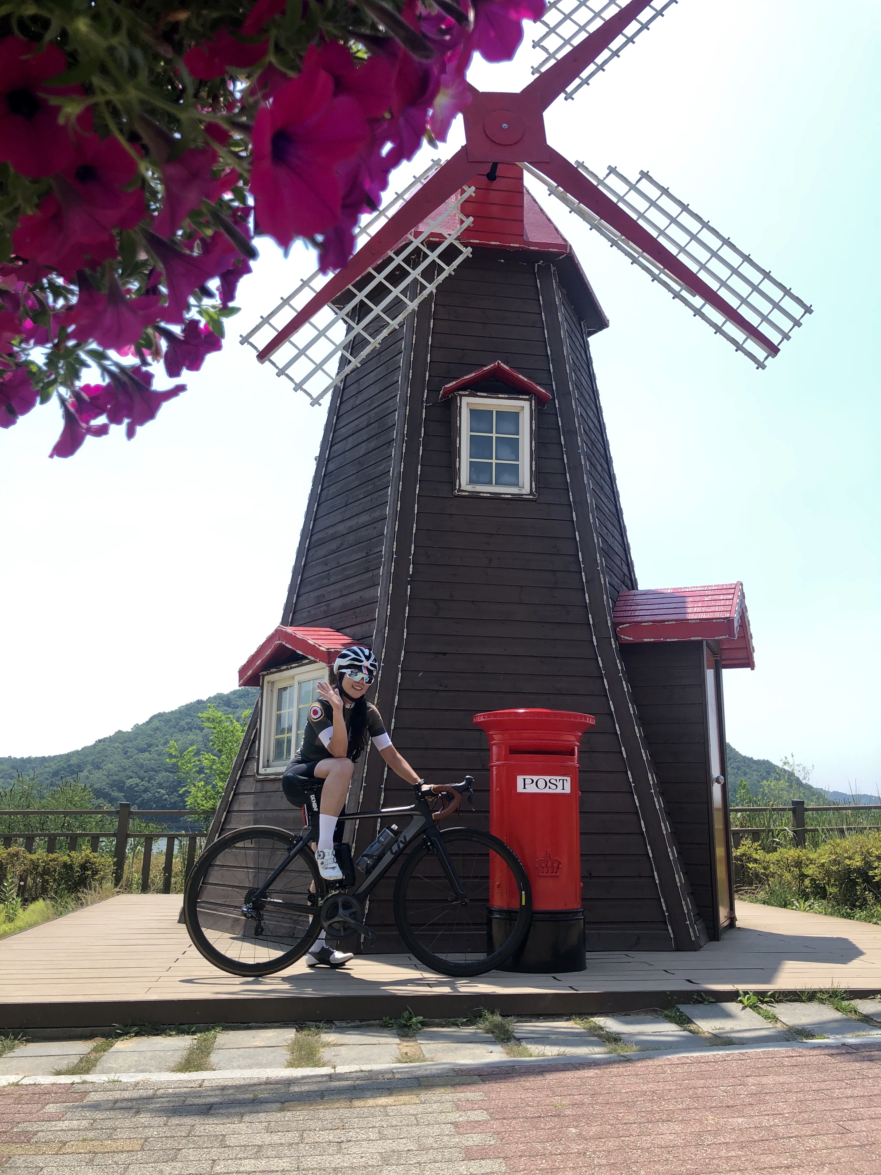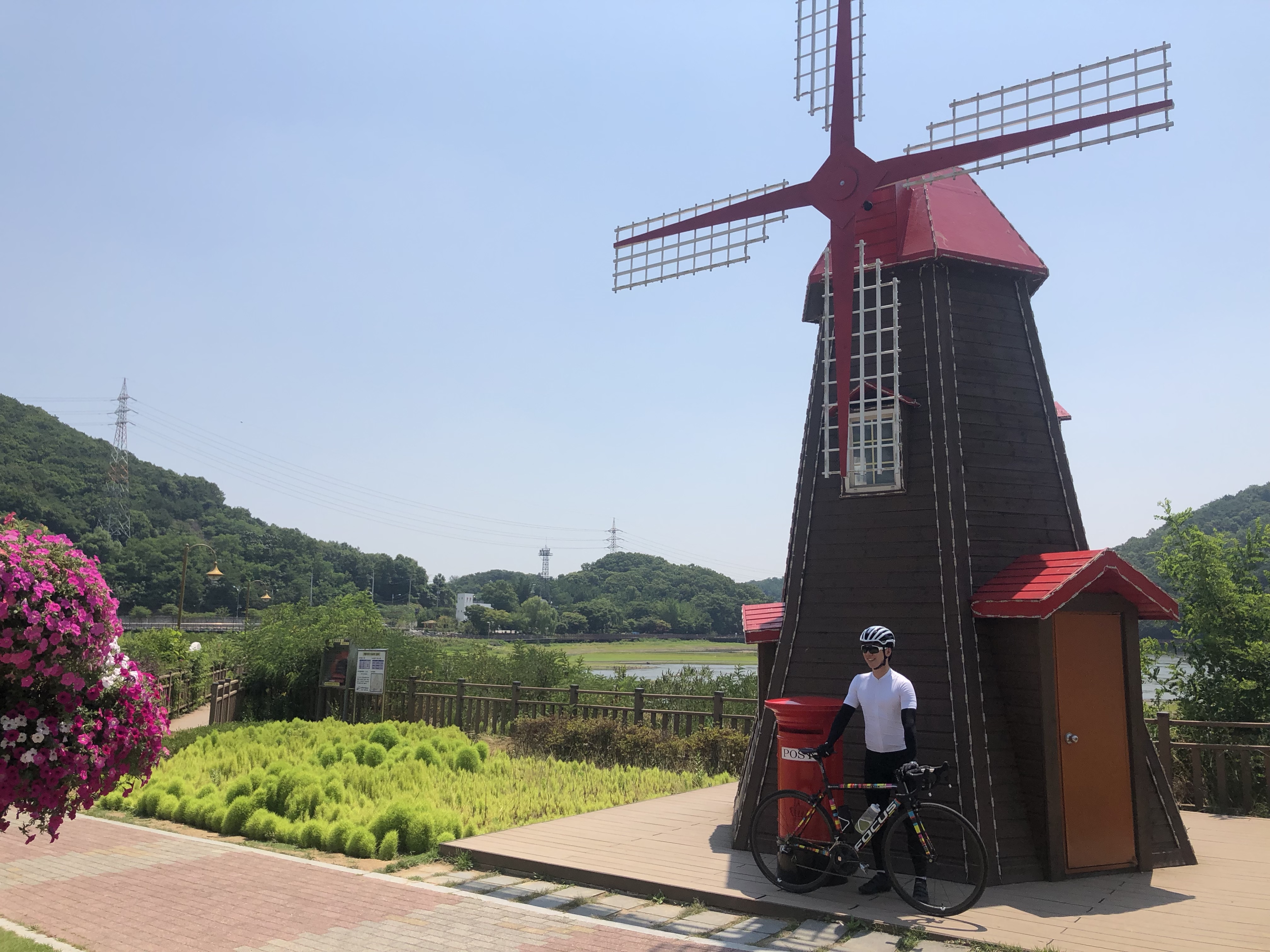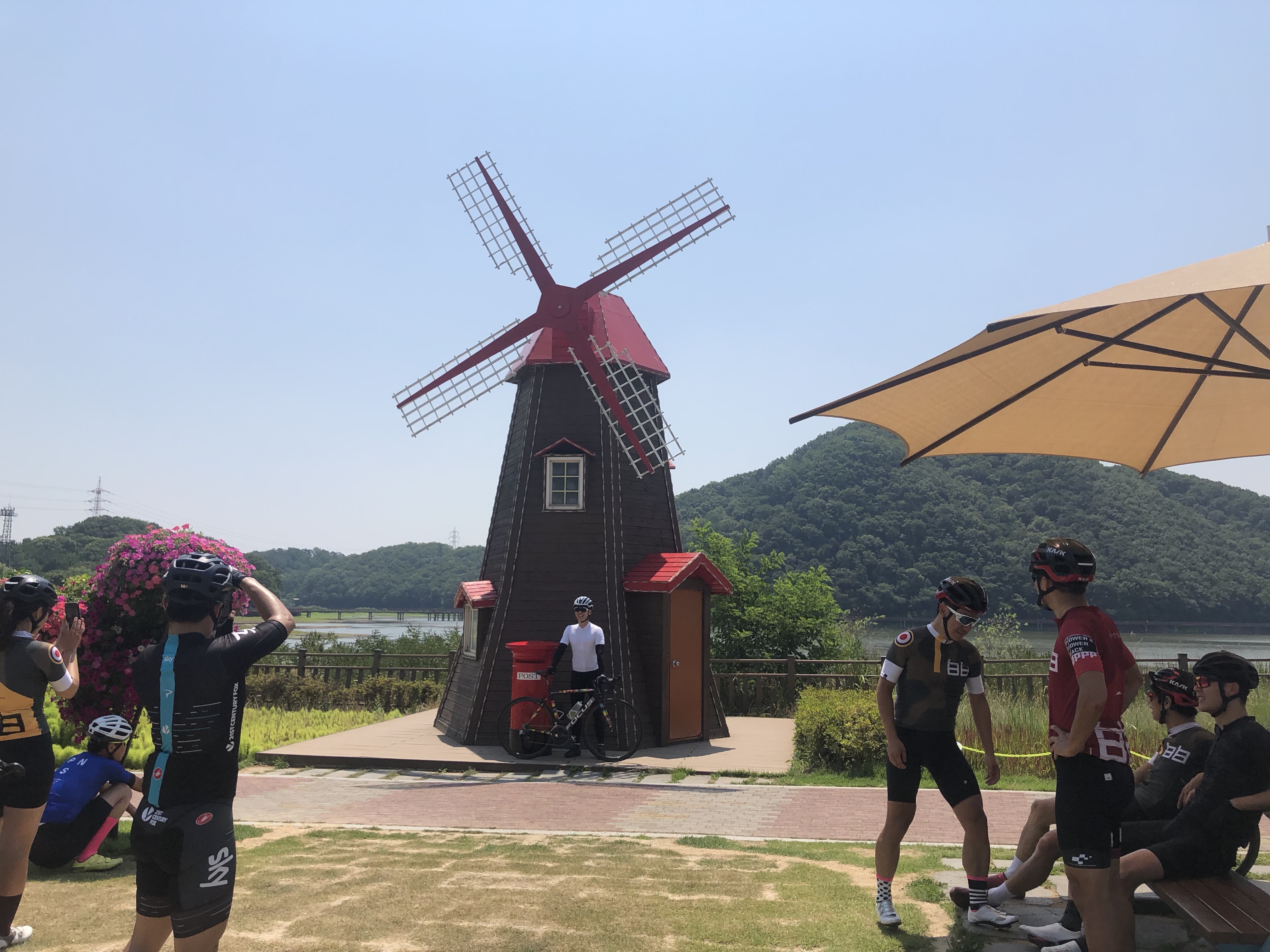 저수지 공원에서 잠시 쉬면서 풍차배경으로 사진도 찍고 ㅋ