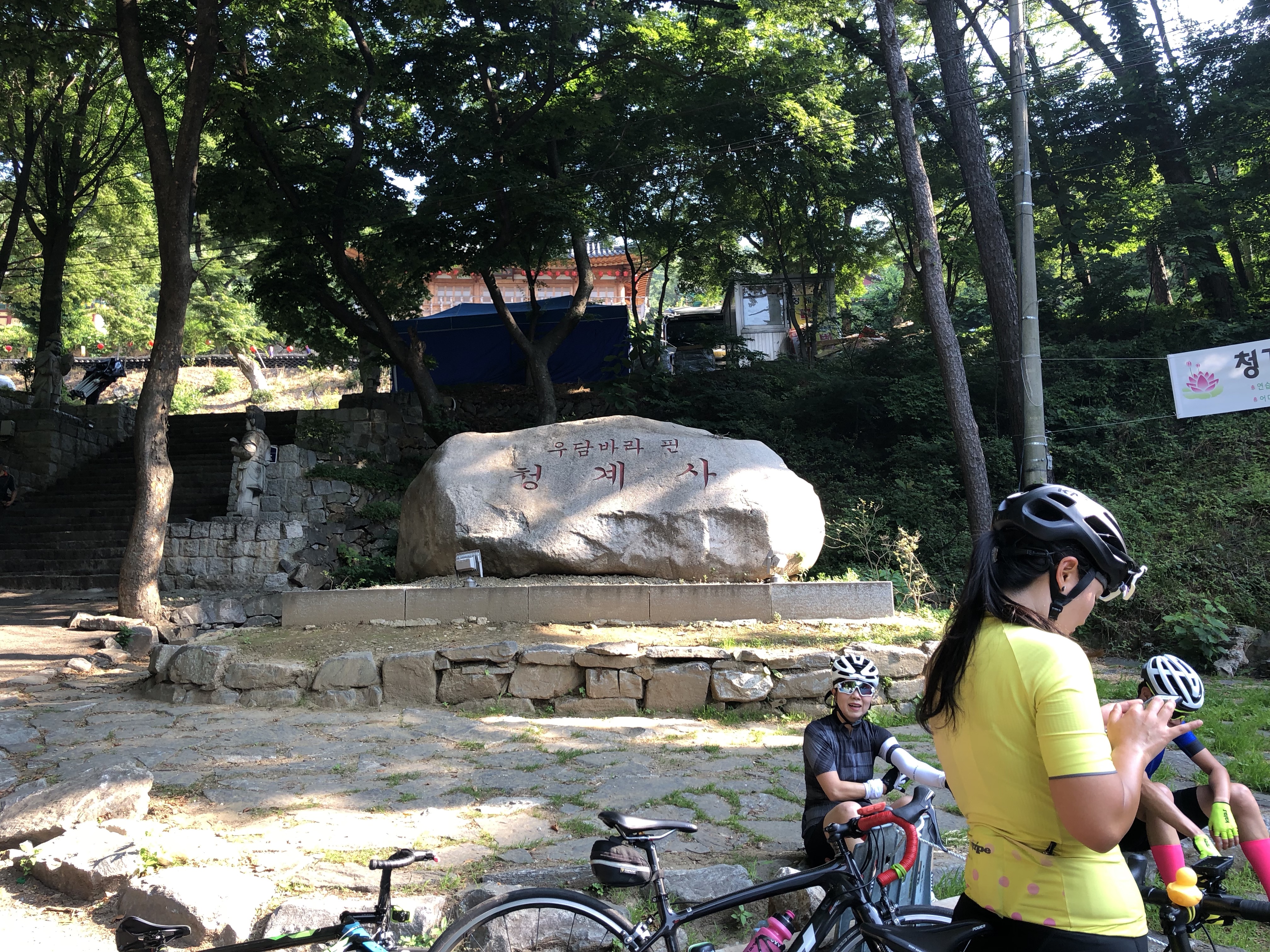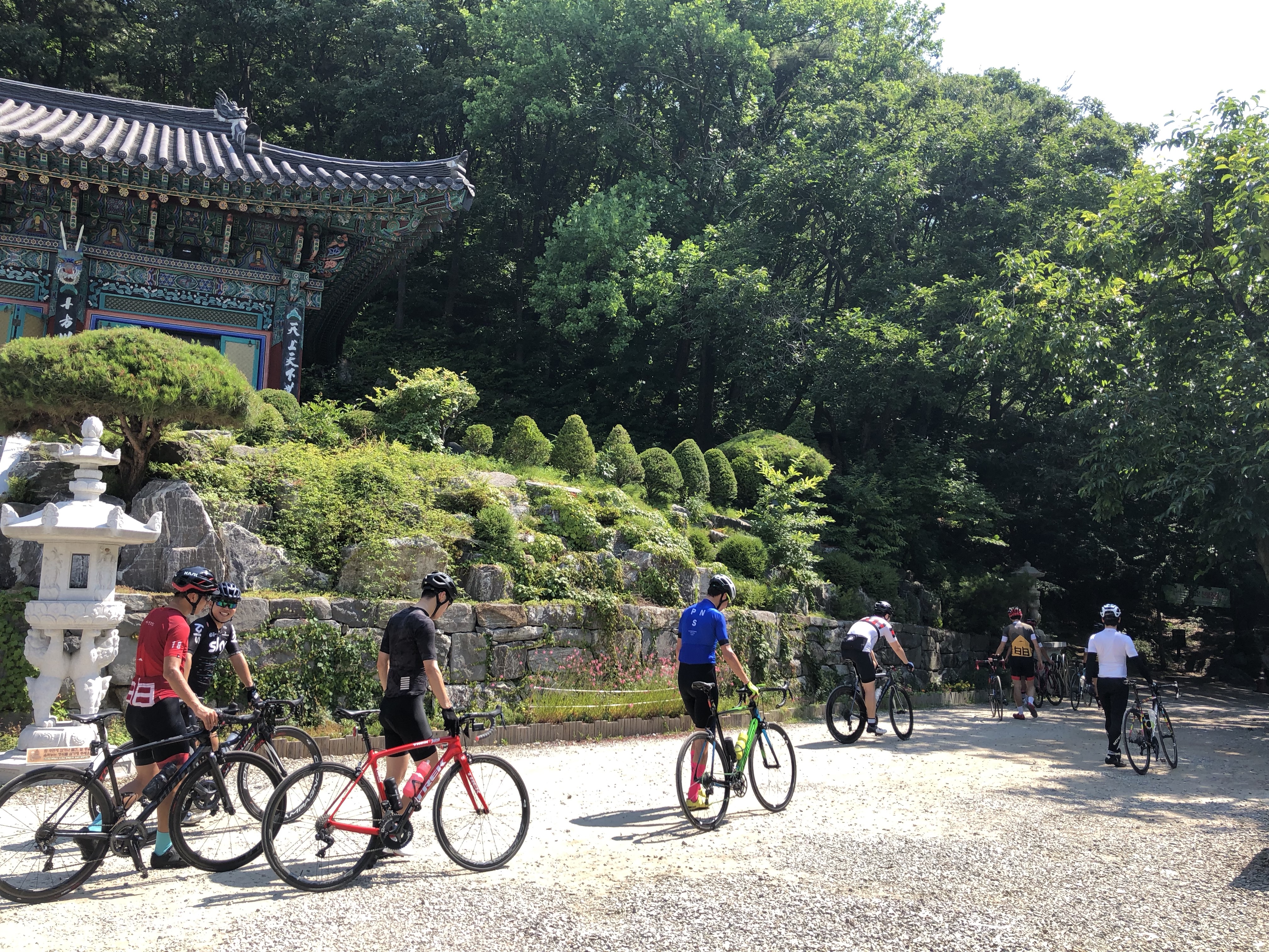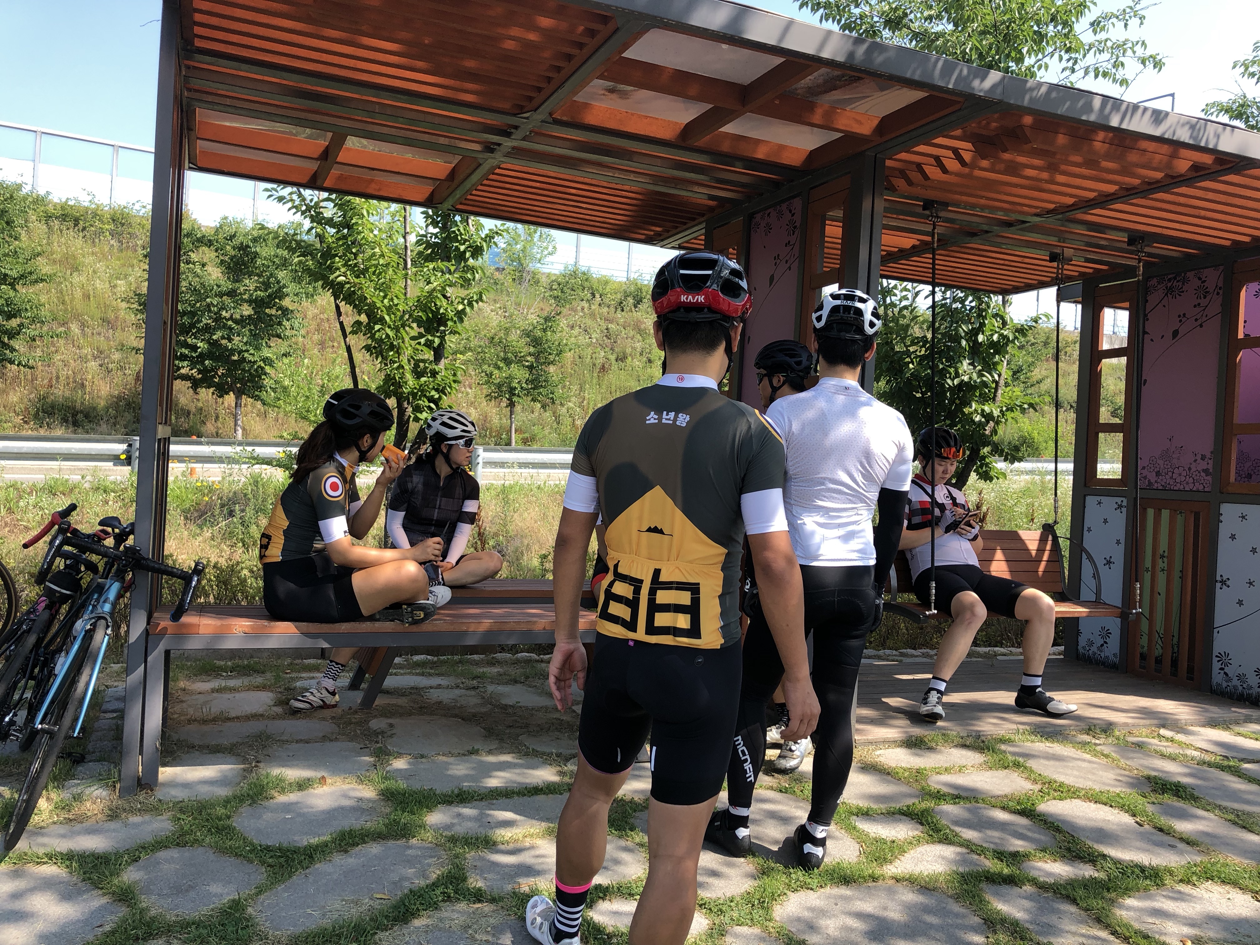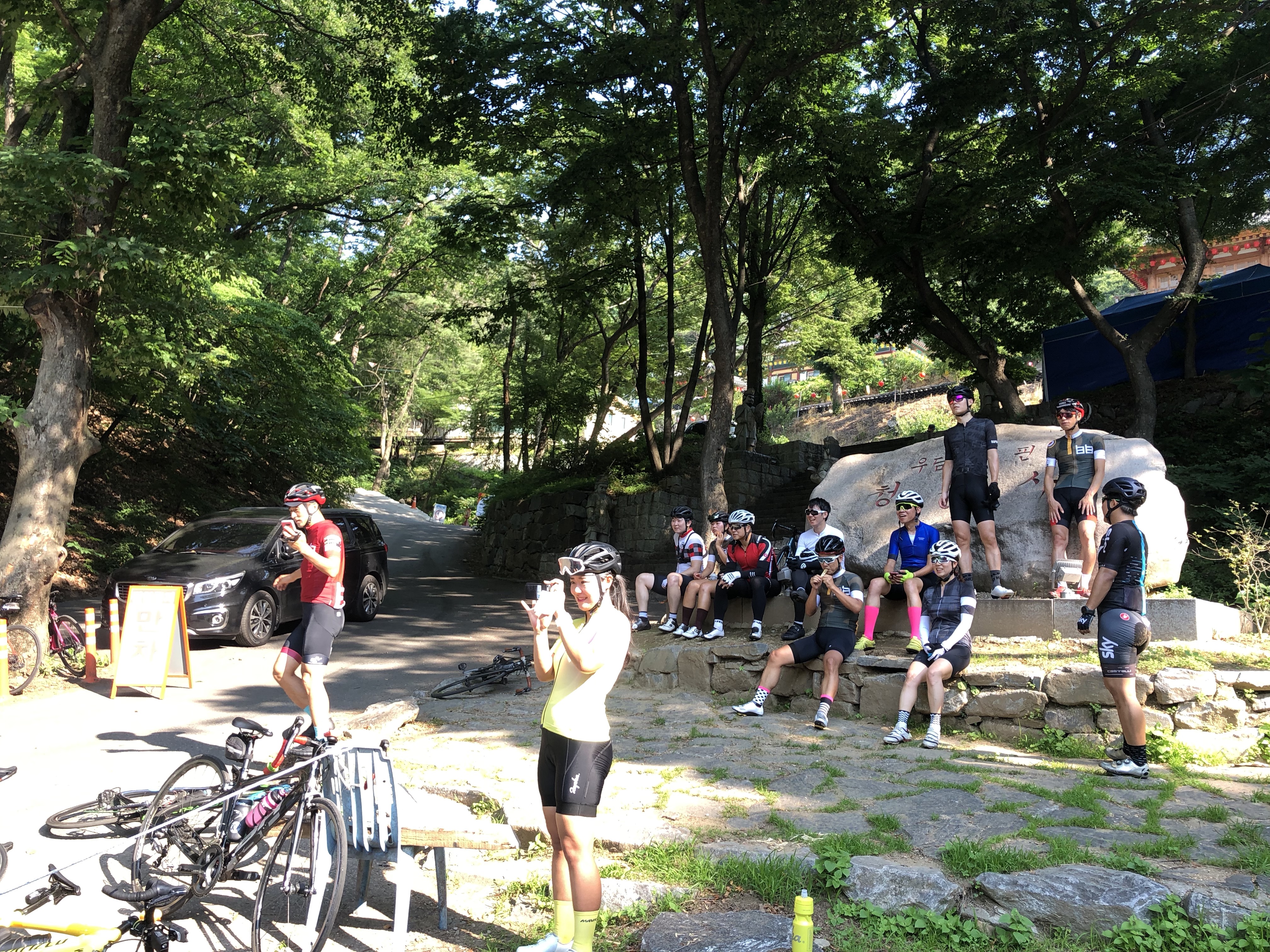 오매기고개를 다운힐해서 내려와서 후미를 기다리며 그늘을 찾아서 쉬는중
