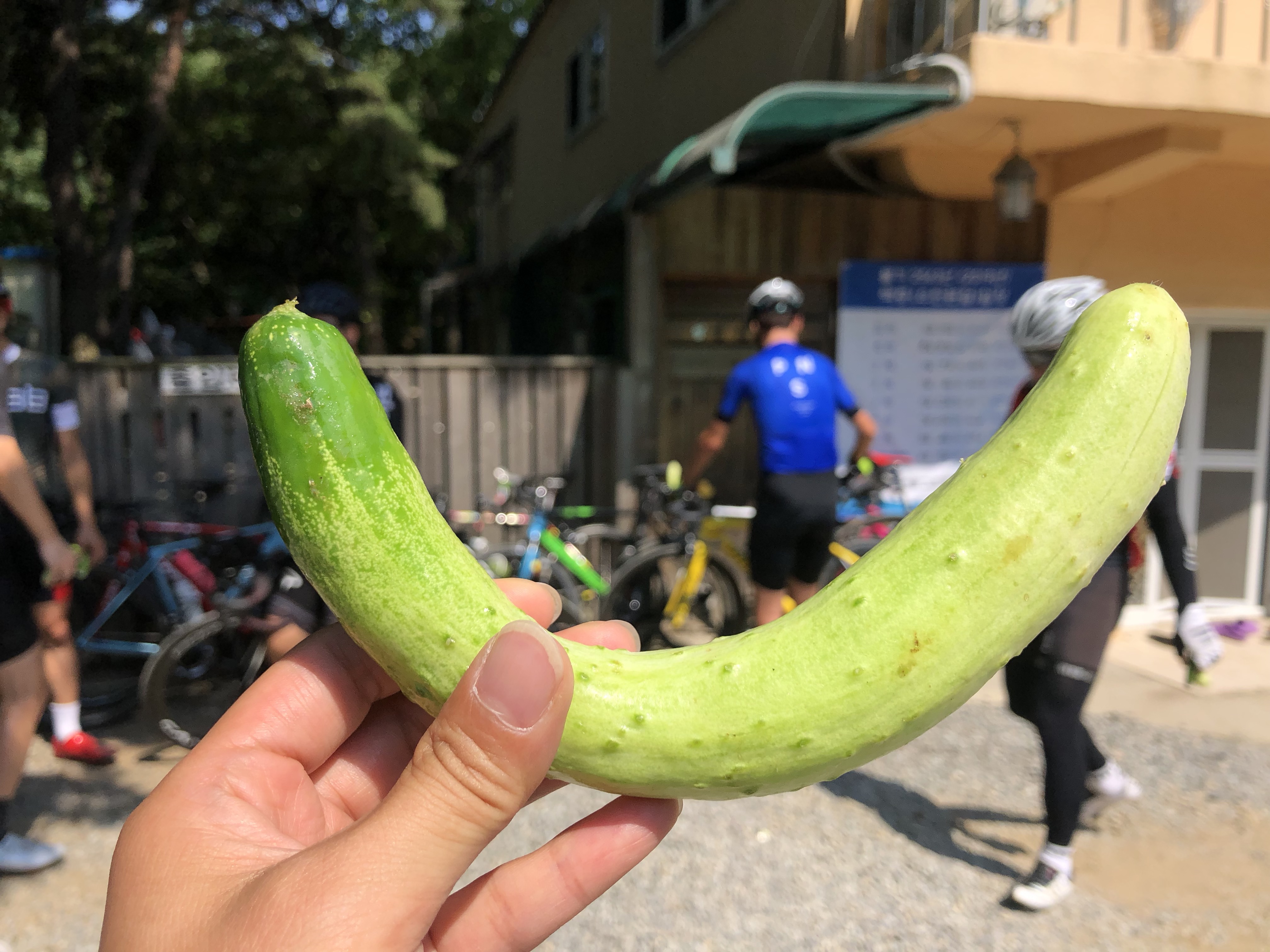 자전거 타고 올라온 우리들 수고했다면서 절에서 일하시는 분이 오이를 주셨어요