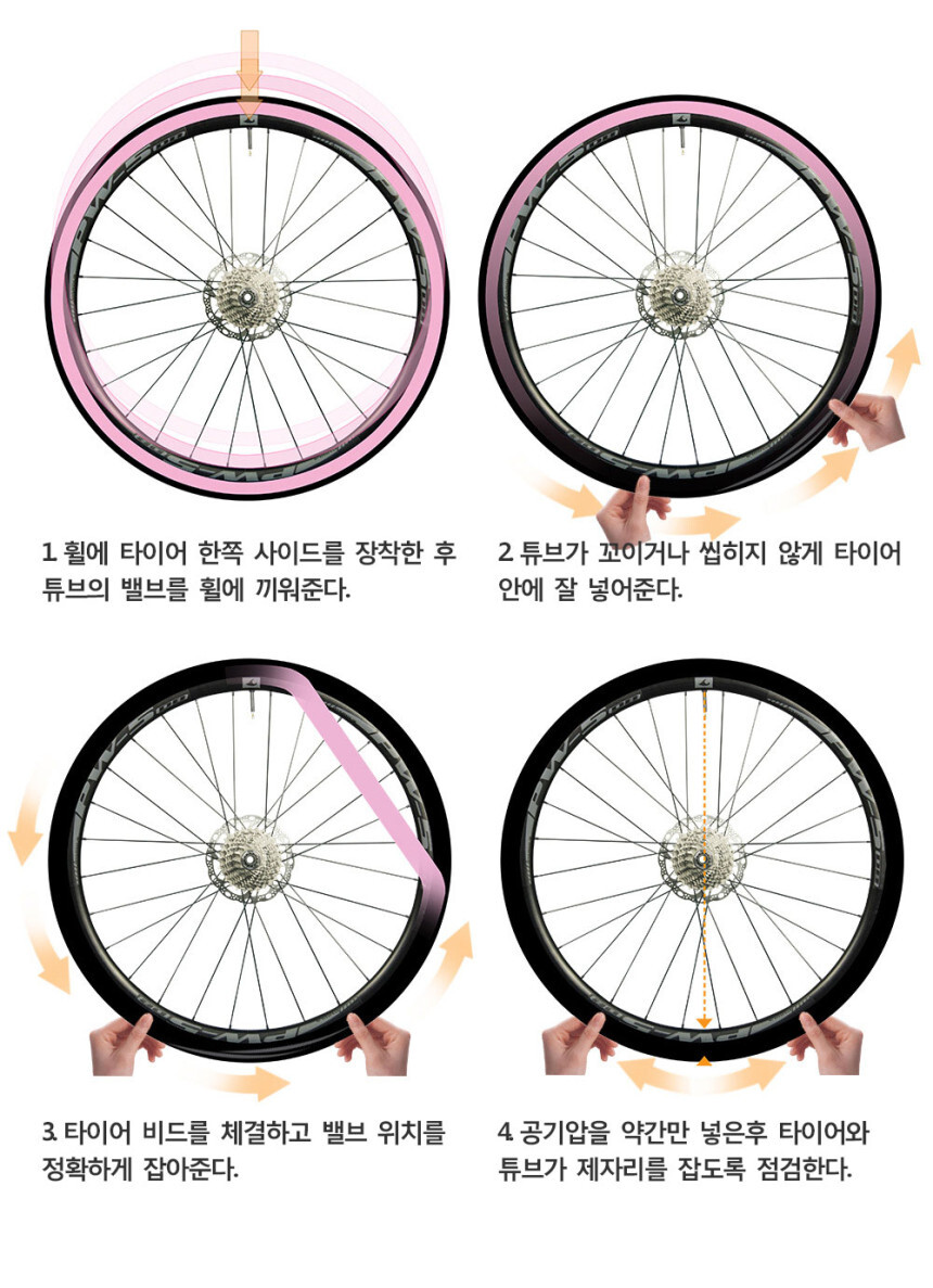 2.튜브가 꼬이거나 씹히지 않게 타이어 안에 잘 넣어준다.
