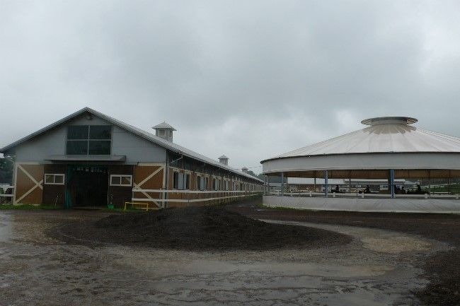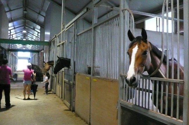 왼쪽이 마방이고 오른쪽이 야외 연습장이예요. 지붕이 커서 비가 내려도 여기서도 강습이 가능하더라구요.