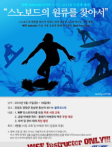 WSFInstructor1 WSF Instructor를 위한 특별한 혜택 2 WSF Instructor를 위한 특별한 혜택 2 무료 서핑 교육과 통돼지 바베큐, Beer Free Party! * 날짜 : 2013년 5월 17일(금) ~ 18일(토) * 장소 : 강원도 양양군 현남면 동산리 90-14 더서프 블루코스트 * 내용 : 1. WSF 인스트럭터를 위한 무료 서핑 교육 2. 금밤 바베큐 파티 - 통돼지 바베큐와 맥주 무한 제공 3. 숙박 및 장비 대여 폭탄 할인(50% 할인, 동반 1인 적용가능) * 회비 : 1만원 (서핑 교육 및 바베큐 파티 입장료 포함) 신청은 KSBA 게시판 http://www.ksba.co.kr/bbs/board.php?bo_table=community_06&wr_id=243 2013. 5. 3. 이전 1 다음